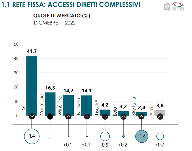 Dunque, secondo i dati dell’Osservatorio AGCOM, al 31 Dicembre 2022 TIM si conferma il leader del mercato di telefonia fissa, con una quota del 41,7% di tutti gli accessi complessivi.