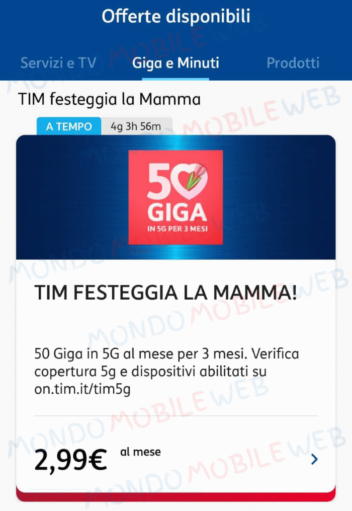 In occasione della Festa della Mamma, che in Italia si festeggia nella seconda Domenica di Maggio, per cui quest’anno la ricorrenza cade il 14 Maggio 2023, in questi giorni TIM sta proponendo una promozione dedicata rivolta ad alcuni suoi già clienti di rete mobile, ossia l’opzione aggiuntiva temporanea denominata 50 Giga 5G Gold, che permette di aggiungere 50 Giga in 5G a 2,99 euro al mese.