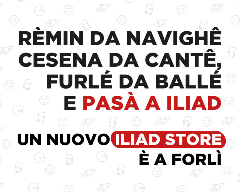 Come già accaduto anche in altre città, per annunciare l’arrivo del nuovo negozio, durante l’allestimento Iliad ha affisso un cartellone con uno slogan in dialetto locale, in questo caso riportante la frase Rémin da navighê, Cesena da cantê, Furlè da ballê e pasà a Iliad, come per riprendere il proverbio Rémin da navighê, Cesena da cantê, Furlè da ballê, Ravenna da magnê, Fenza da lavurê, Lug da imbrujê, Jémula da fé l’amor.