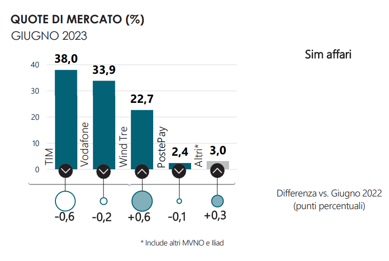 Nelle SIM affari il miglior incremento su base annuale del secondo trimestre 2023 lo ha ottenuto WINDTRE, con un incremento dello 0,6%, mentre il raggruppamento che include gli altri MVNO e Iliad Italia (iliadbusiness) è cresciuto dello 0,3%. Rispetto allo stesso periodo del 2022, PosteMobile di PostePay registra un lieve calo dello 0,1%, mentre Vodafone e TIM perdono rispettivamente lo 0,2% e lo 0,6%.