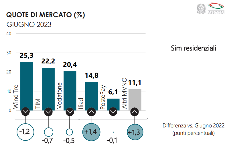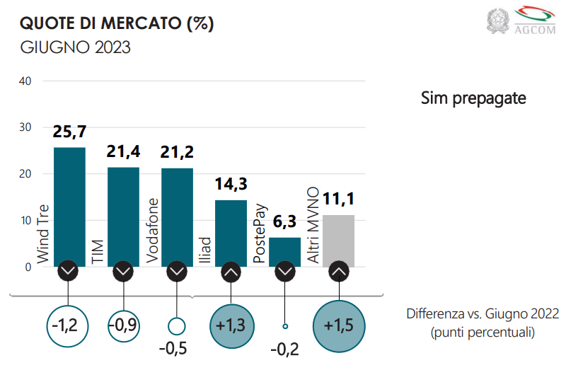 Secondo il dato delle SIM Human complessive al 30 Giugno 2023, Iliad Italia è salita al 12,8%, seguita poi da PosteMobile che rappresentava il 5,6%, mentre il raggruppamento degli operatori virtuali ha raggiunto complessivamente una quota di mercato del 10%.