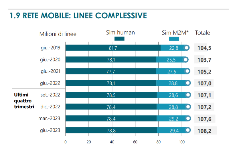 Per quanto riguarda le SIM Human (cioè quelle “solo voce”, “voce+dati” e “solo dati” che prevedono interazione umana), al 30 Giugno 2023 queste erano pari a 78,8 milioni, dato che risulta essere in crescita sia su base annua (aumento di 602mila unità) che su base trimestrale (incremento di circa 354mila unità).