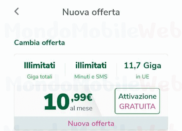 In questi ultimi giorni e alcune settimane fa, nell’app Very Mobile un numero ridotto di già clienti Very Mobile nella sezione “Gestisci offerta”, sono riusciti a visualizzare e attivare la nuova offerta mobile con Giga, minuti e SMS illimitati a 10,99 euro al mese. Questa nuova offerta è stata proposta come cambio offerta.