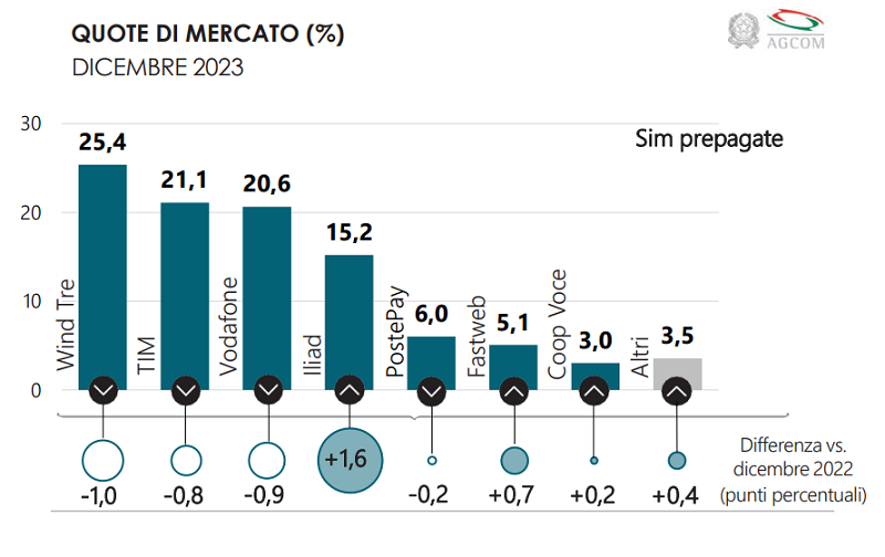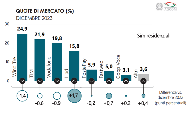 Infatti, rispetto allo stesso periodo del 2022, Iliad Italia ha guadagnato l’1%, Fastweb lo 0,4%, CoopVoce lo 0,1%, mentre gli altri MVNO lo 0,3%.