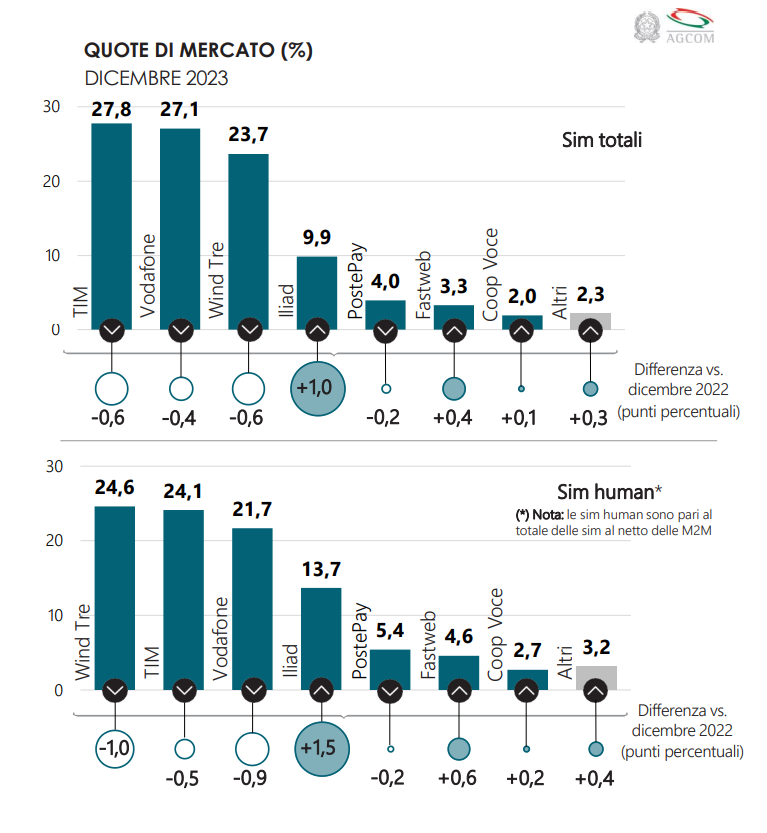 Iliad Italia è salita al 13,7% delle SIM Human complessive a fine 2023, seguita poi da PosteMobile che rappresentava il 5,4%, poi Fastweb Mobile con il 4,6% e CoopVoce con il 2,7%.