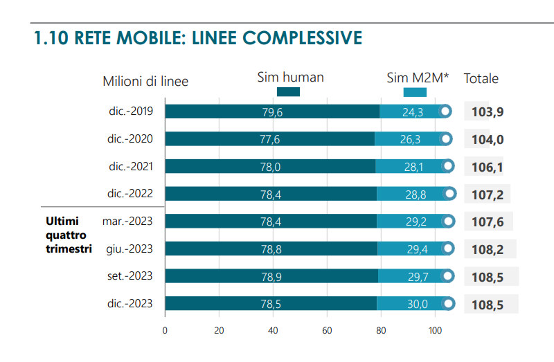 Invece, le SIM Machine to Machine (M2M), cioè quelle che consentono lo scambio di dati, informazioni e comandi tra dispositivi, da macchina a macchina, al 31 Dicembre 2023 queste erano pari a 30 milioni, in questo caso con un dato in crescita sia su base trimestrale (incremento di circa 342mila unità) che su base annua (circa 1,203 milioni in più).