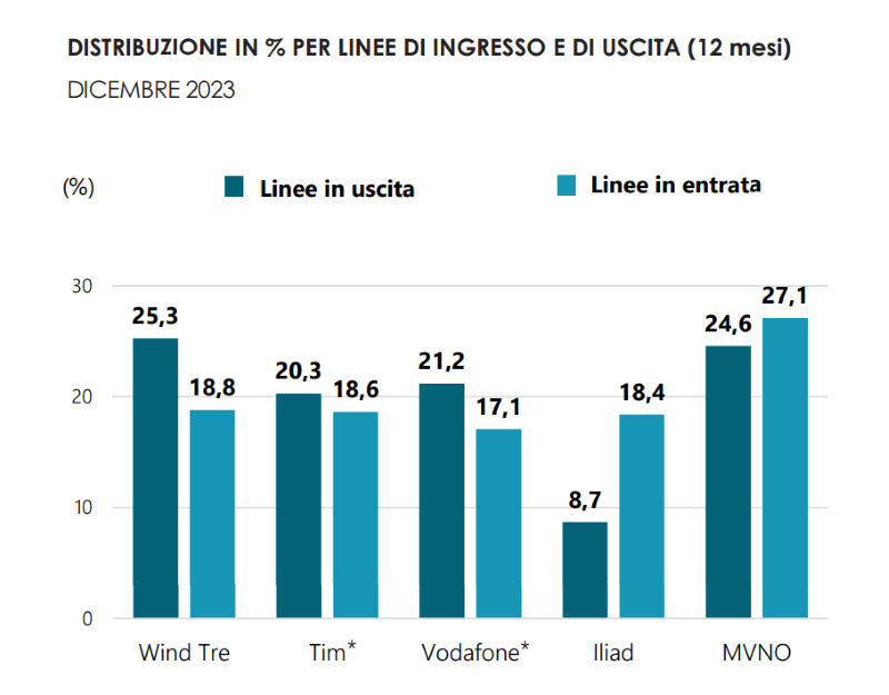 Come di consueto, la distribuzione in percentuale delle linee in ingresso e in uscita è rappresentata attraverso un grafico, prendendo in considerazione i dati degli operatori TIM, Vodafone, Wind Tre (di cui fa parte il brand principale WINDTRE), Iliad Italia e di tutti gli operatori virtuali (MVNO) raggruppati.