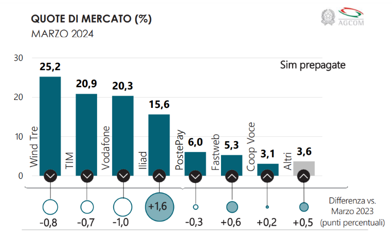 Invece, rispetto al trimestre precedente, a fine Marzo 2024 WINDTRE ha guadagnato lo 0,1%, mentre TIM e Vodafone hanno perso entrambe lo 0,3%.