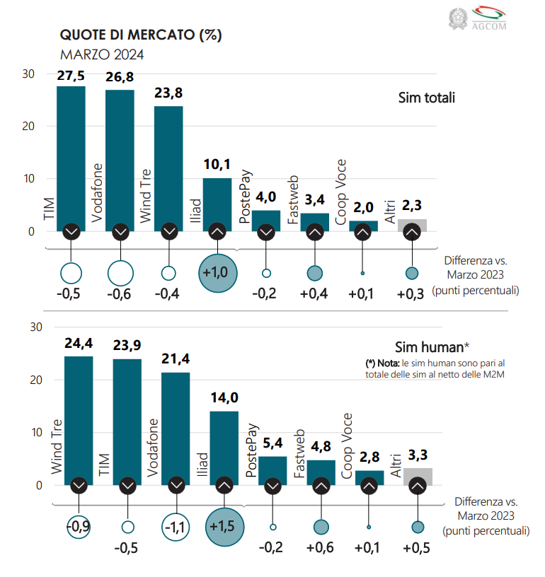 Iliad Italia ha raggiunto il 14% delle SIM Human complessive a fine Marzo 2024, seguita poi da PosteMobile che rappresentava sempre il 5,4%, poi Fastweb Mobile con il 4,8% e CoopVoce con il 2,8%. Infine, il raggruppamento con tutti gli altri operatori virtuali ha raggiunto complessivamente una quota di mercato del 3,3%.