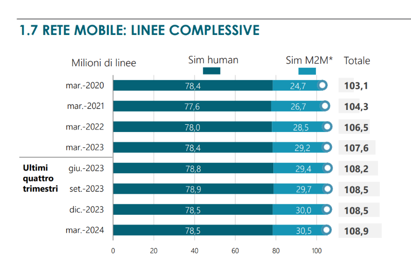 Le SIM Human (cioè quelle “solo voce”, “voce+dati” e “solo dati” che prevedono interazione umana), a fine Marzo 2024 erano pari a circa 78,5 milioni, in lieve crescita su base annua (aumento di circa 58mila unità), mentre si registra un lieve calo su base trimestrale (pari a circa 9mila unità).