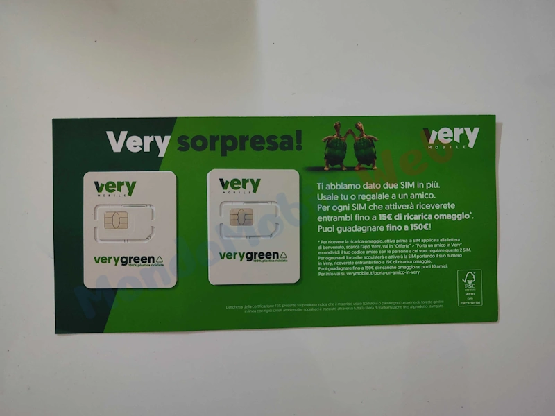 In questi giorni, attraverso l’iniziativa chiamata Very Sorpresa, i nuovi clienti Very Mobile che acquistano una nuova SIM con spedizione a domicilio possono ottenere in omaggio, anziché una soltanto, anche due schede telefoniche aggiuntive, questa volta di colore bianco anziché verde come la SIM principale.