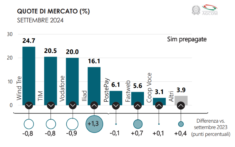 Rispetto allo stesso periodo del 2023, TIM ha perso il 2%, mentre WINDTRE, PosteMobile di PostePay e Fastweb hanno mantenuto invariate le loro quote.