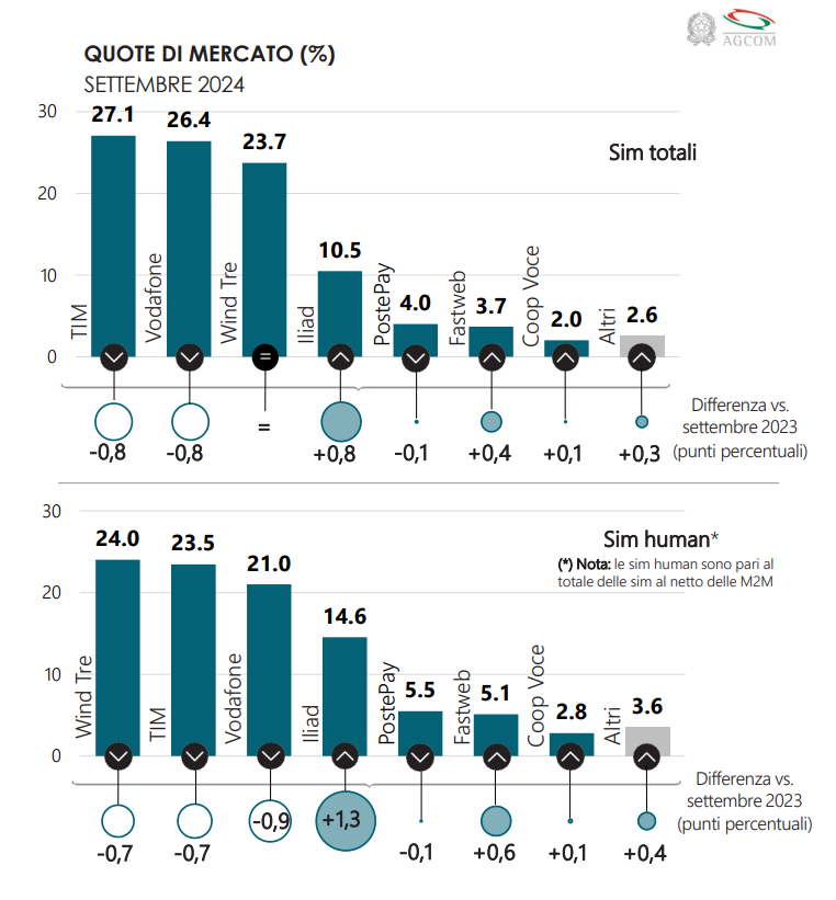 Iliad Italia ha raggiunto il 14,6% delle SIM Human complessive a fine Settembre 2024, seguita poi da PosteMobile, che rappresentava il 5,5%, poi Fastweb Mobile con il 5,1% e CoopVoce ancora con il 2,8%.