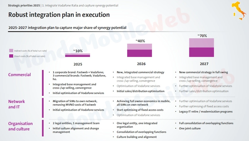 Secondo quanto indicato nelle slide, per il 2026 il piano di integrazione di Fastweb + Vodafone prevede una nuova e integrata strategia commerciale, con una iniziale ottimizzazione delle vendite e della distribuzione.