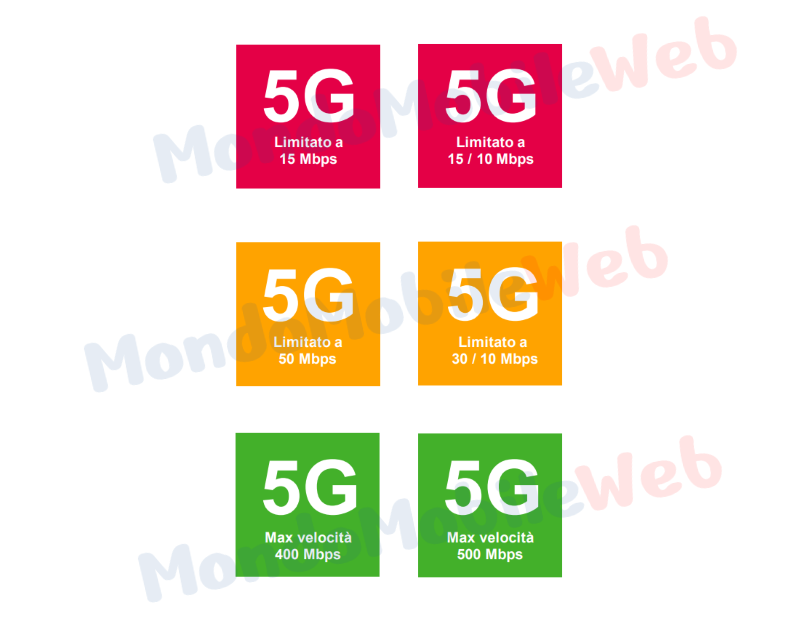 In questo caso, in base al limite di velocità imposto, sono stati previsti due bollini quadrati, uno di colore giallo e uno di colore rosso, con la scritta 5G in bianco all’interno, accompagnata dalla scritta, sempre in bianco, che specifica il limite di velocità applicato (“limitato a XX Mbps”).