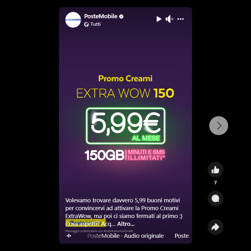 Il contenuto pubblicitario, in particolare, è stato pubblicato sotto forma di reel sulla pagina Facebook ufficiale dell’operatore, con in coda un link che dovrebbe reindirizzare alla pagina del sito PosteMobile dove poter attivare l’offerta in promozione.