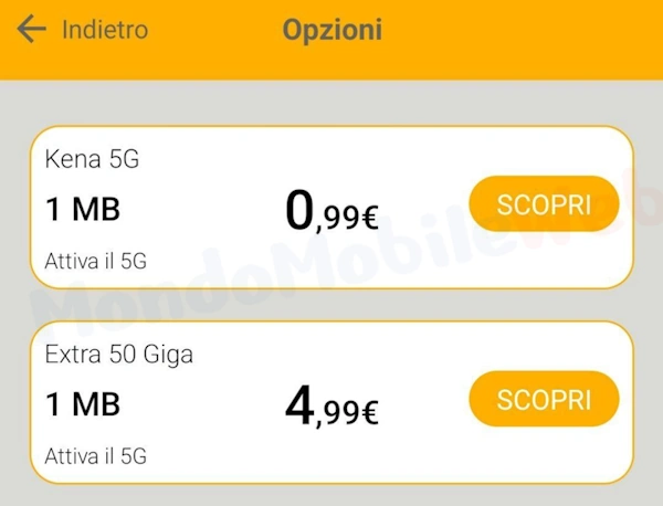 Al momento, per questa nuova opzione aggiuntiva, nella sezione “Opzioni” dell’app viene indicato per errore soltanto 1 MB e la frase “Attiva il 5G”, esattamente come nell’opzione Kena 5G che permette di aggiungere il 5G adesso pagando un costo aggiuntivo pari a 0,99 euro al mese.