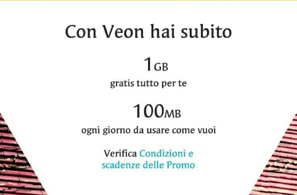 “Grazie per la registrazione sull’App Veon di Wind. Se ha un’offerta con internet incluso, Wind le riserva dei vantaggi esclusivi: subito 1GIGA gratis e in più ogni giorno, al primo accesso all’app, 100Mega da consumare entro la mezzanotte del giorno stesso. Verifichi tutti i suoi Bonus su Veon.“