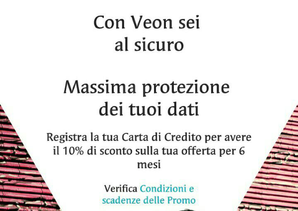 VEON CREDIT CARD PROMO da diritto per 6 mesi (180 giorni) ad uno sconto pari al 10% sui costi di rinnovo delle offerte a canone ricorrente attive sulla propria SIM. Si attiva contestualmente o successivamente alla registrazione su Veon di una Carta di Credito, una Carta Prepagata o PostePay. L’attivazione della promozione sarà confermata con un SMS. La promozione è applicabile una sola volta per SIM registrata a Veon.