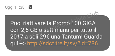 In queste ore 3Italia ha inviato un sms ad alcuni suoi clienti, che in precedenza, avevano attivato Promo 100 Giga nel 2016. Ecco l’sms inviato: “Puoi riattivare la Promo 100 GIGA con 2,5 GB a settimana per tutto il 2017 a soli 29€ una Tantum! Guarda qui —> http://sdcf.tre.it/sv/?id=786“. Non è escluso che, l’offerta Promo 100 Giga, sarà proposta “ad personam” anche ad altri clienti 3Italia che non avevano attivato la promozione nelle edizioni precedenti.