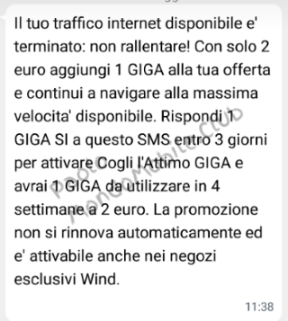 Ecco un sms informativo inviato: “Il tuo traffico internet disponibile è terminato: non rallentare! Con solo 2 euro aggiungi 1 GIGA alla tua offerta e continui a navigare alla massima velocità disponibile. Rispondi 1 GIGA SI a questo SMS entro 30 giorni per attivare Cogli l’Attimo Giga e avrai 1 GIGA da utilizzare in 4 settimane a 2 euro. La promozione non si rinnova automaticamente ed attivabile anche nei negozi esclusivi Wind.“