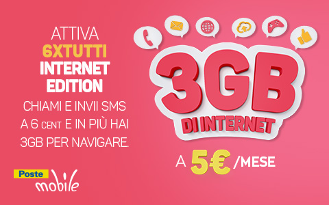La promozione “6xTutti Internet Edition” consente di arricchire il piano “6XTutti” con l’Opzione Mobile 3 GB offerta al costo promozionale di 5 euro mensili, per navigare in Internet con 3 giga al mese alla velocità del 4G.