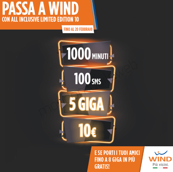 La promozione Wind All Inclusive Limited Edition è attivabile dal 9 al 20 Febbraio 2017 per i clienti Tim e per i clienti di tutti gli Operatori Virtuali (escluso PosteMobile e A-Mobile) che passano a Wind su nuova SIM Ricaricabile.