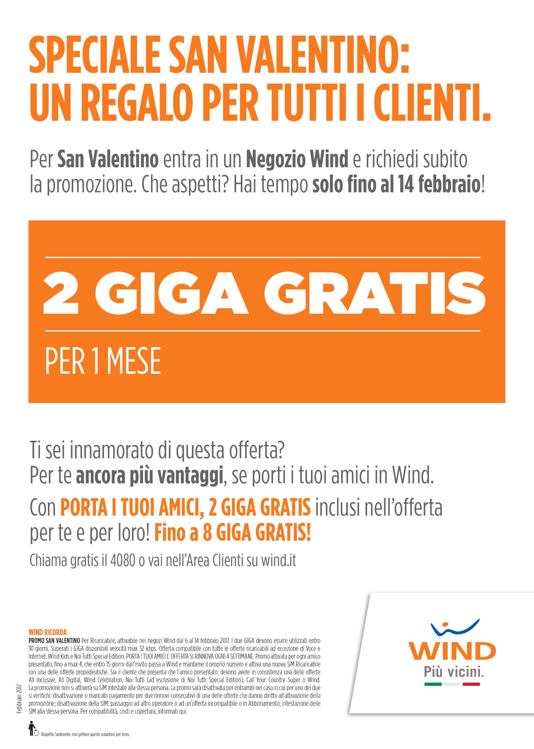 In occasione della festa degli innamorati, Wind regala 2 Giga gratuiti in più, per 1 mese, di traffico Internet 4G LTE. La promozione è sottoscrivibile da tutti i clienti ricaricabili privati, senza alcun costo di attivazione, esclusivamente fino al 14 febbraio in tutti Negozi Wind.