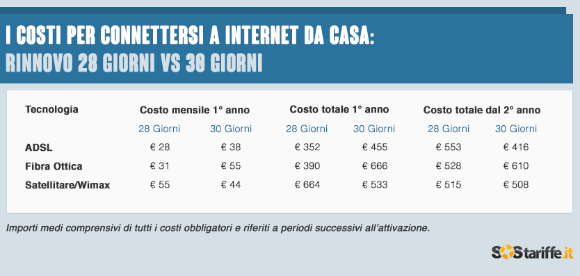Di conseguenza, il costo totale durante il primo anno con le tariffe a rinnovo ogni 28 giorni è più basso rispetto quello previsto dalle offerte mensili, sia per l’ADSL che per la fibra ottica. Nel caso delle offerte ADSL a 28 giorni, durante il primo anno di contratto si risparmiano 103 Euro, mentre con la fibra ottica si pagano ben 276 Euro in meno rispetto alle offerte a 30 giorni (23% e 41% di risparmio annuo, rispettivamente).