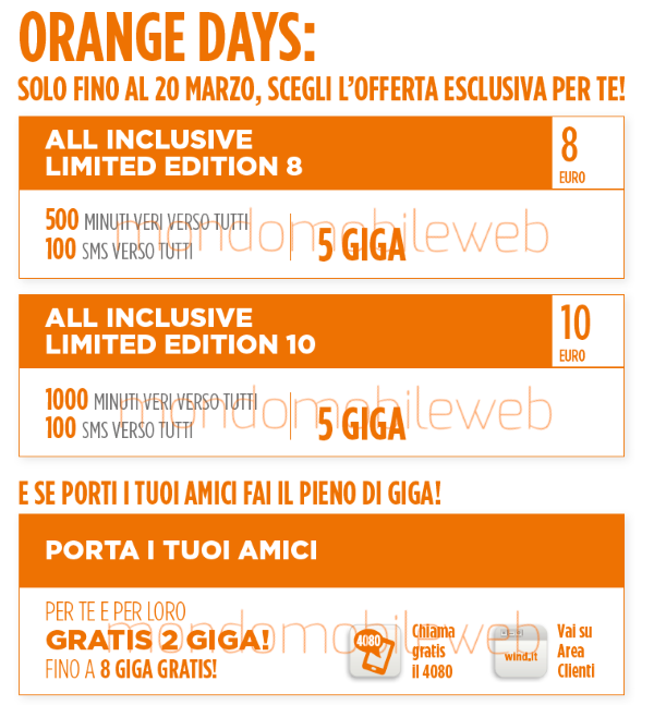 Fino al 20 Marzo 2017 Wind ha riservato due offerte speciali Orange Days All Inclusive Limited Edition in esclusiva per chi passa a Wind (MNP) da TIM o Operatori Virtuali (escluso PosteMobile) contestualmente all’attivazione di una nuova sim ricaricabile nei Negozi Wind aderenti. Le offerte speciali sono: All Inclusive Limited Edition 8 e All Inclusive Limited Edition 10.
