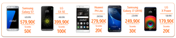 Ecco il nuovo listino: Samsung Galaxy S7 579,90 euro anzichè 629,90 euro (sconto 50 euro); LG G5 SE 399,90 euro anzichè 499,90 euro (sconto 100 euro); Huawei P9 Lite 279,90 euro anzichè 299,90 euro (sconto 20 euro); Samsung Galaxy J7 2016 a 249,90 euro anzichè 279,90 euro (sconto 30 euro); LG X Power a 179,90 euro anzichè 199,90 euro (sconto 20 euro); Lo sconto è applicato solo nel caso di acquisto in un’unica soluzione.