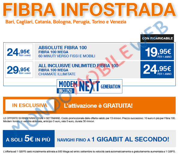 Dopo Milano, Bologna, Torino, Perugia e Bari, anche a Cagliari, Catania e Venezia arriva Fibra Infostrada FTTH fino a 1 Gigabit al secondo. Secondo alcune indiscrezioni prossimamente anche a Padova e Palermo. L’offerta ad 1 GBPS sarà inizialmente attivata a 500 Mega ed entro settembre la velocità sarà automaticamente e gratuitamente aumentata a 1 GBPS. In promozione l’attivazione è gratuita.