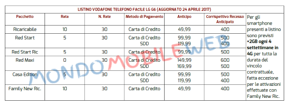 Con l’acquisto di un LG G6 il cliente Vodafone ricaricabile riceverà in omaggio 2 Giga in 4G ogni 4 settimane per 30 rinnovi sulla propria offerta base. E’ previsto un corrispettivo recesso anticipato di 400 euro.