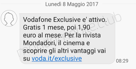 Da oggi 8 Maggio 2017, come vi avevamo anticipato in anteprima, Vodafone Exclusive regala una rivista digitale Mondadori per 1 anno. Ecco sms inviato quando si attiva il servizio: “Vodafone Exclusive, è attivo. Gratis 1 mese, poi 1,90 euro al mese. Per la rivista Mondadori, il cinema e scoprire gli altri vantaggi vai su voda.it/exclusive“.