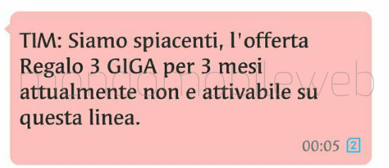 In alcuni casi invece abbiamo ricevuto il seguente SMS: “Siamo spiacenti, Regalo 3 GIGA per 3 mesi attualmente non e attivabile su questa linea.