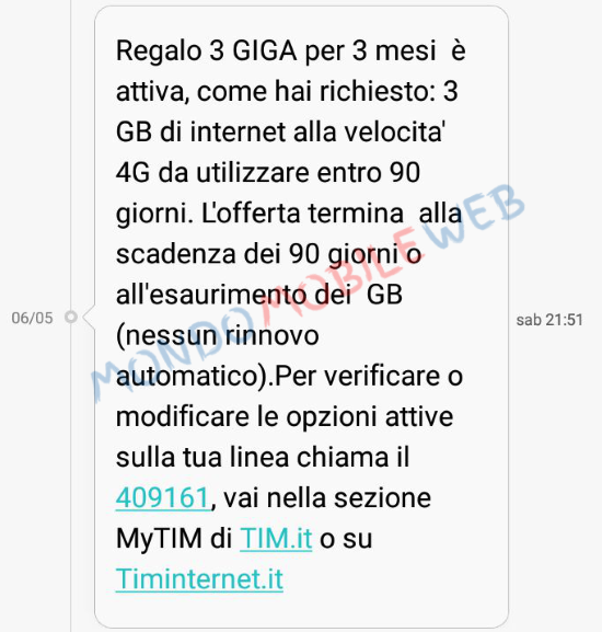 Noi di MondoMobileWeb.it abbiamo provato su alcune sim ricaricabili, ci è arrivato il seguente SMS: “Regalo 3 GIGA per 3 mesi  è attiva, come hai richiesto: 3 GB di internet alla velocita’ 4G da utilizzare entro 90 giorni. L’offerta termina  alla scadenza dei 90 giorni o all’esaurimento dei GB (nessun rinnovo automatico). Per verificare o modificare le opzioni attive sulla tua linea chiama il 409161, vai nella sezione MyTIM di TIM.it o su Timinternet.it“.