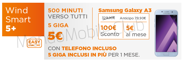 Dal 5 al 22 Maggio 2017, salvo eventuali cambiamenti, in alcuni casi, è possibile attivare la nuova offerta ricaricabile esclusiva Wind Smart 5+ con 500 minuti verso tutti e 5 Giga di Internet Mobile 4G/LTE a 5 euro ogni 4 settimane a tempo indeterminato. Il costo di attivazione è di 9 euro anzichè 19 euro con nuova SIM attiva per 24 mesi. In caso contrario è previsto l’addebito dei restanti 10 euro (se è presente credito residuo).