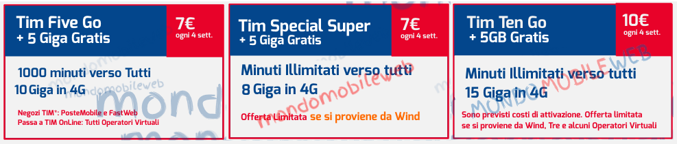 - Tim Special Extra (se si proviene anche da Vodafone) offre 1000 minuti verso tutti i numeri fissi e mobili nazionali e 1 GB di traffico dati. Inoltre, per 6 volte dall’attivazione sono previsti 2GB aggiuntivi ogni 4 settimane alla velocità del 4G di TIM in promozione gratuita. Il prezzo del primo canone anticipato e dei successivi rinnovi è di 10 euro ogni 4 settimane per 6 volte dall’attivazione. Dal sesto rinnovo i 2GB aggiuntivi e la velocità del 4G TIM si rinnovano a 3 euro in più ogni 4 settimane.