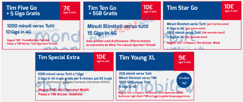 - Tim Special Extra (se si proviene anche da Vodafone) offre 1000 minuti verso tutti i numeri fissi e mobili nazionali e 1 GB di traffico dati. Inoltre, per 6 volte dall’attivazione sono previsti 2GB aggiuntivi ogni 4 settimane alla velocità del 4G di TIM in promozione gratuita. Il prezzo del primo canone anticipato e dei successivi rinnovi è di 10 euro ogni 4 settimane per 6 volte dall’attivazione. Dal sesto rinnovo i 2GB aggiuntivi e la velocità del 4G TIM si rinnovano a 3 euro in più ogni 4 settimane.