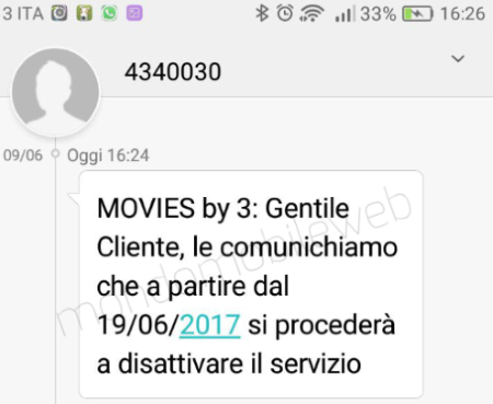 In questi giorni Tre sta inviando il seguente SMS ai suoi clienti: “Movies by 3: Gentile Cliente, le comunichiamo che a partire dal 19/06/2017 si procederà a disattivare il servizio“.