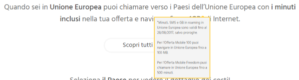 FastWeb comunica: “Quando sei in Unione Europea puoi chiamare verso i Paesi dell’Unione Europea con i minuti inclusi nella tua offerta e navigare fino a 1GB di Internet. Minuti, SMS e GB in roaming in Unione Europea sono validi fino al 28 Agosto 2017, salvo proroghe. Per l’Offerta Mobile 100 puoi navigare in Unione Europea fino a 100 MB. Per l’Offerta Mobile Freedom puoi chiamare in Unione Europea fino a 500 minuti.“