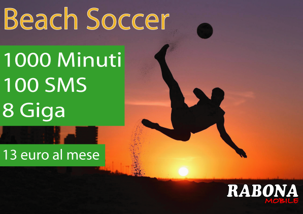 Da ieri 17 Luglio 2017, salvo eventuali cambiamenti, è possibile attivare la nuova offerta Beach Soccer dell’operatore virtuale Rabona Mobile che offrirà 1000 minuti verso tutti i numeri nazionali, 100 sms verso tutti e 8 Giga di Internet Mobile.