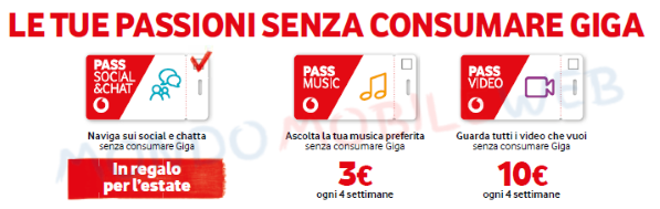Anche le altre offerte Vodafone Pass Music (3 euro in più ogni rinnovo) e Vodafone Pass Video (10 euro in più ogni rinnovo), dedicate a tutti i clienti Vodafone con un’offerta dati attiva, che vogliono vivere le proprie passioni senza limiti e senza preoccuparsi di consumare i Giga della propria offerta, sono state prorogate ufficialmente fino al 31 Agosto 2017.