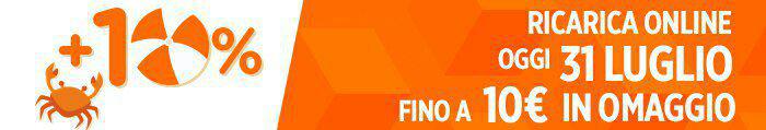 Per tutta la giornata del 31 Luglio 2017 se si effettua una ricarica di 2 euro si avranno 2,20 euro di ricarica. Se si effettua una ricarica di 5 euro, si avranno 5,50 euro di ricarica. Se si effettua una ricarica di 10 euro, si avranno 11 euro di ricarica. Se si effettua una ricarica di 15 euro, si avranno 16,50 euro di ricarica. Se si effettua una ricarica di 25 euro, si avranno 27,50 euro di ricarica. Se si effettua una ricarica di 50 euro, si avranno 55 euro di ricarica. Se si effettua una ricarica di 100 euro, si avranno 110 euro di ricarica. Quindi si può ricevere fino a 10 euro di ricarica in omaggio.