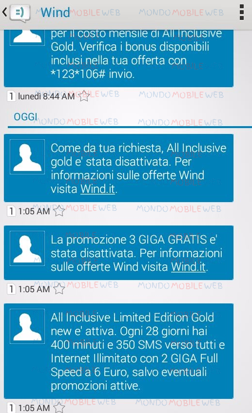 Per completare l’attivazione dell’offerta dedicata, il cliente Wind dovrà rispondere all’SMS ricevuto seguendo le indicazioni in esso riportate (testo: “GOLD NEW“). Una volta inviata la risposta, il cliente Wind riceverà un SMS di presa in carico della richiesta; per usufruire dell’offerta, dovrà comunque attendere l’SMS di conferma attivazione. E’ necessario avere credito residuo sufficiente nella SIM per attivare l’offerta.