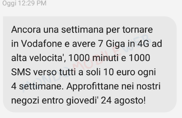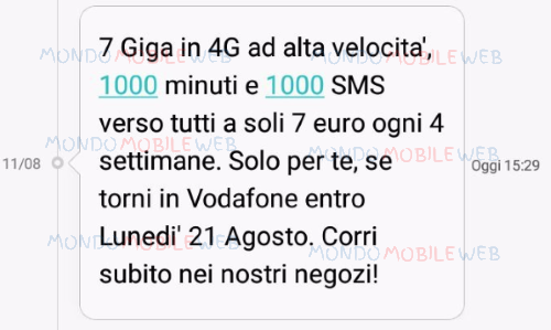 Ecco l’sms inviato nella versione a 7 euro: “7 Giga in 4G ad alta velocità, 1000 minuti e 1000 sms verso tutti a soli 7 euro ogni 4 settimane. Solo per te, se torni in Vodafone entro lunedì 21 Agosto 2017. Corri subito nei nostri negozi!“.