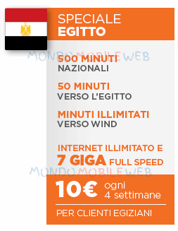 Call Your Country Speciale Egitto offre 500 minuti di chiamate nazionali, minuti illimitati verso tutti i numeri Wind nazionali, 50 minuti verso l’Egitto e 7 Giga di traffico dati 2G/3G/4G a 10 euro ogni 4 settimane.