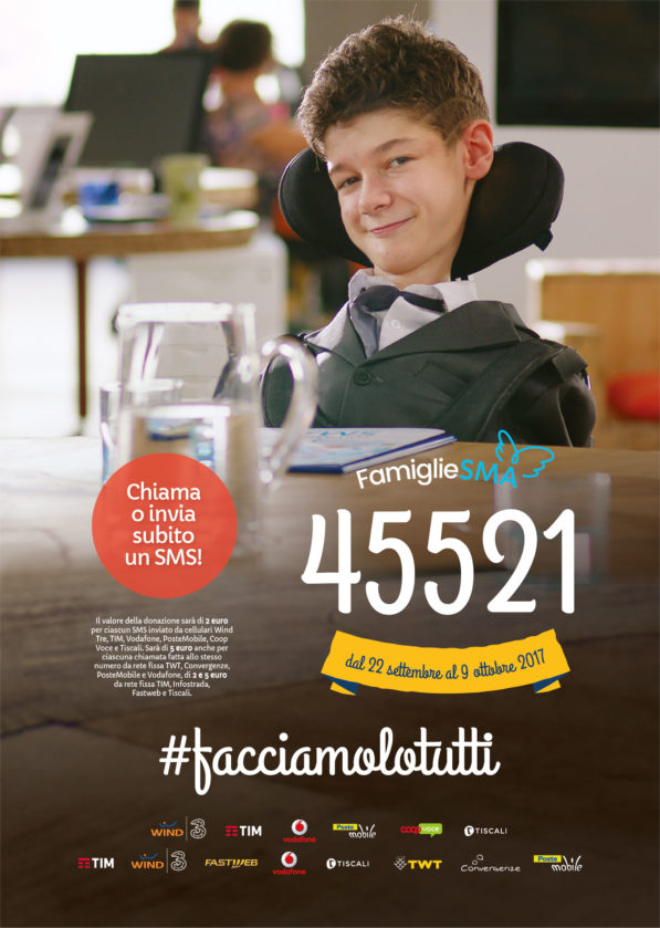 È partita il 22 settembre 2017 la campagna di sensibilizzazione nazionale che durerà fino al 9 Ottobre 2017, promossa dall’Associazione Famigle SMA e finalizzata alla raccolta fondi a sostengo della ricerca scientifica. La raccolta di quest’anno è a supporto dei piccoli pazienti affetti da Atrofia Muscolare Spinale, una malattia delle cellule nervose del midollo spinale quelle, per intenderci, da cui partono i segnali diretti ai muscoli.