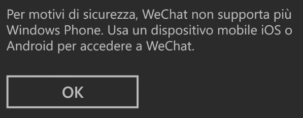 Da adesso, WeChat non è più funzionante su Windows Phone e su Windows 10 Mobile. Provando ad accedere al client, troveremo il segente mesaggio: “Per motivi di sicurezza, WeChat non supporta più Windows Phone. Usa un dispositivo mobile iOS o Android per accedere a WeChat”.  Tuttavia, Rimane attivo su PC e tablet Windows 10.