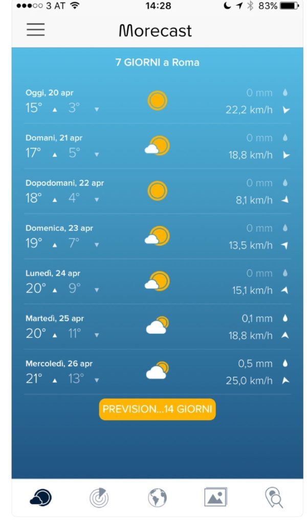 “Morecast” è un’ applicazione meteo, utile perché informa l’utente sul meteo in maniera abbastanza precisa e in tempo reale. L’applicazione si aggiunge alla lunga lista di app riguardanti il meteo, anche se sembra discostarsene, per certi versi, per alcune caratteristiche che possiede.
